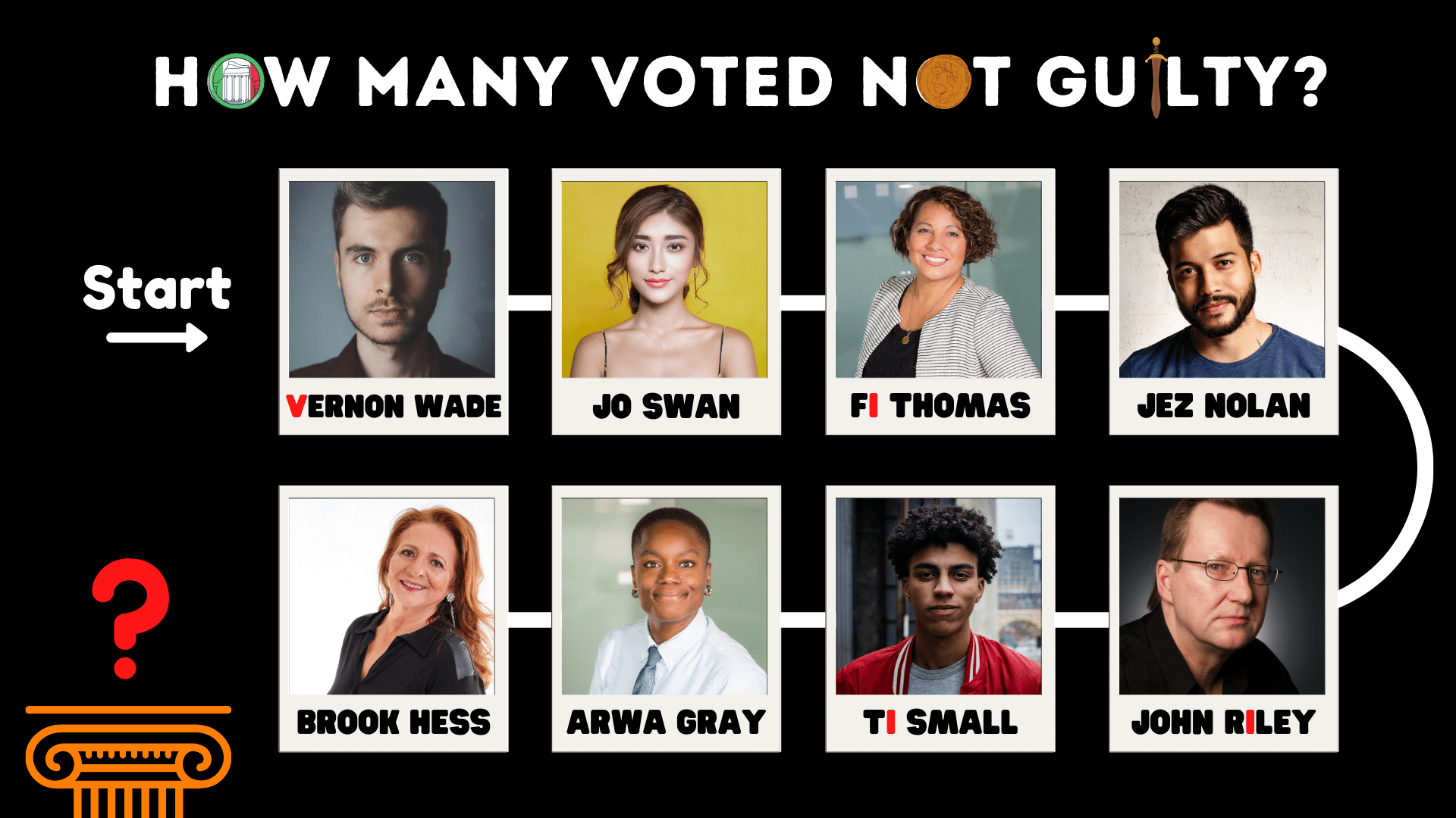 The symbols around the screen lead to ROME, so you are looking for Roman Numerals. Look for roman numerals within the Names. As shown in the image below. This will lead to VIII, which is 8.