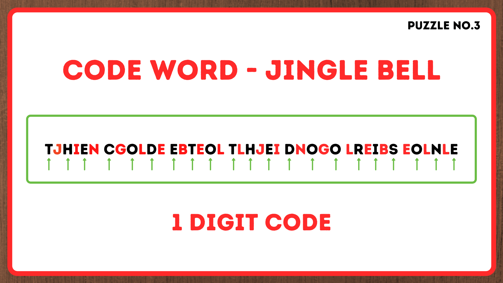 The code word is JINGLE BELL. This code word has been inserted between each letter of the code that gives away the number. Take out the word JINGLE BELL and it will give you THE CODE TO THE DOOR IS ONE.